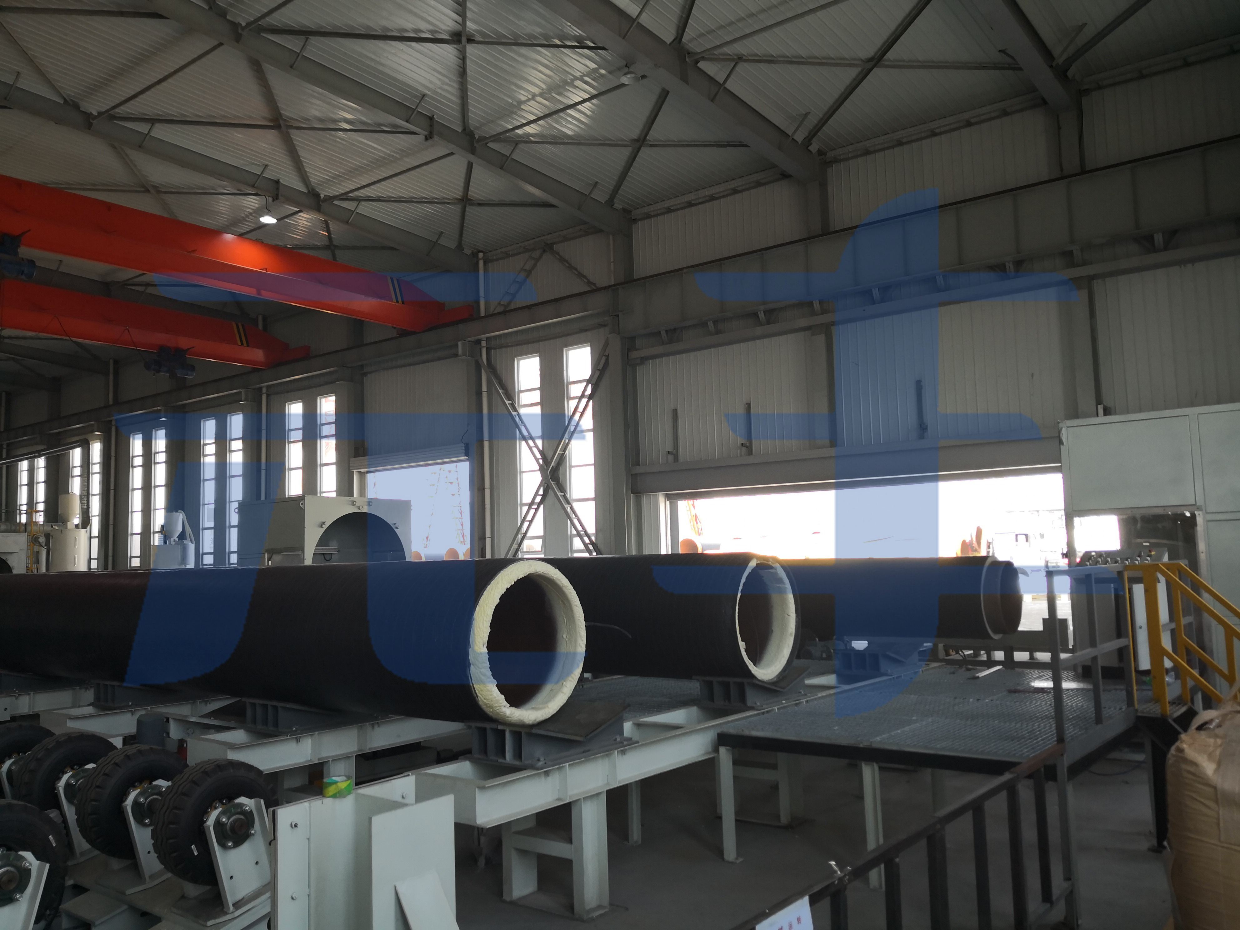 噴涂纏繞保溫管工藝流程為:經過拋丸的鋼管經中頻加熱裝置進行表面加熱,然后旋轉通過泡沫噴涂區,噴涂機將聚氨酯泡沫逐層噴涂至工作鋼管表面,聚氨酯泡沫熟化后的鋼管通過纏繞區,擠出機擠出聚乙烯片料進行多層纏繞,經水冷卻后成型,完成防腐保溫工作。最后經過管道切割設備對管口兩端多出部門進行切除,保留150-250mm管口端,完成噴涂纏繞保溫管道的制作。