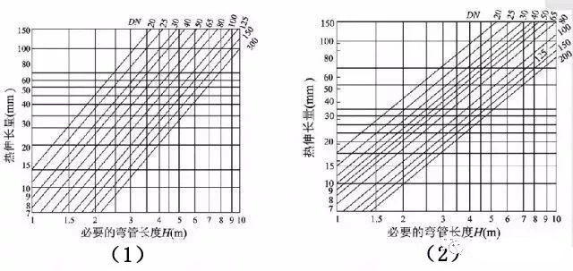 為簡化計(jì)算,常用線算圖來確定L型補(bǔ)償器的短臂長度和Z型補(bǔ)償器的中間臂長度。圖二(1)是L型彎管段自然補(bǔ)償線算圖,(2)是Z型彎管段自然補(bǔ)償線算圖。